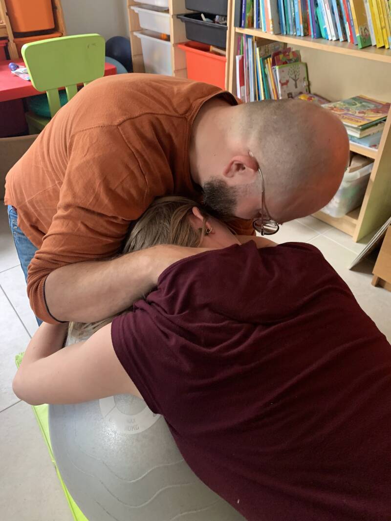 Na een tijd in bad, voel ik me plots heel erg onzeker. De weeën zijn weg. 'Het stopt', zeg ik en ik kijk rond mij. Iedereen verzekert me dat het niet meer zal stilvallen. Ik voel niks meer en kijk vragend naar de vroedvrouw. Ik zeg haar dat ik hem ook niet meer voel zakken, ik voel niks meer van mijn eigen lichaam en vind het beangstigend. Ik besluit zelf even te voelen en kan zijn hoofdje al lager voelen zitten. Dat geeft moed!