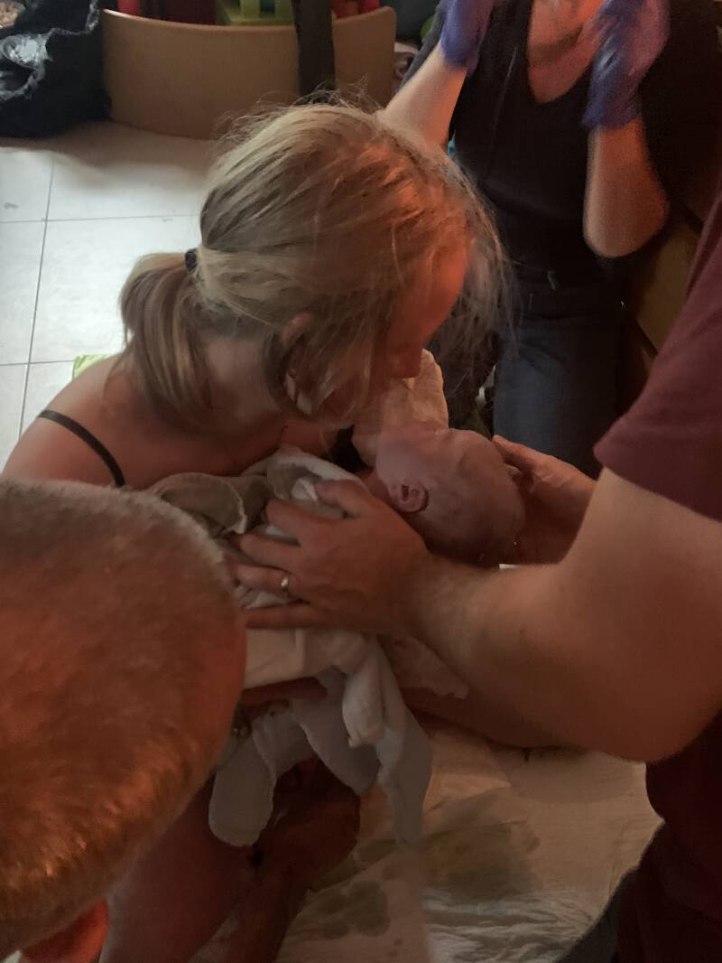 De vroedvrouw die Elsa en Lenn zag geboren worden, is er nu ook bij. Zij was enkel de maandag van wacht, dus het moest ergens ook zo zijn. Dit machtige geboorteteam aan mijn zijde, was écht goud!